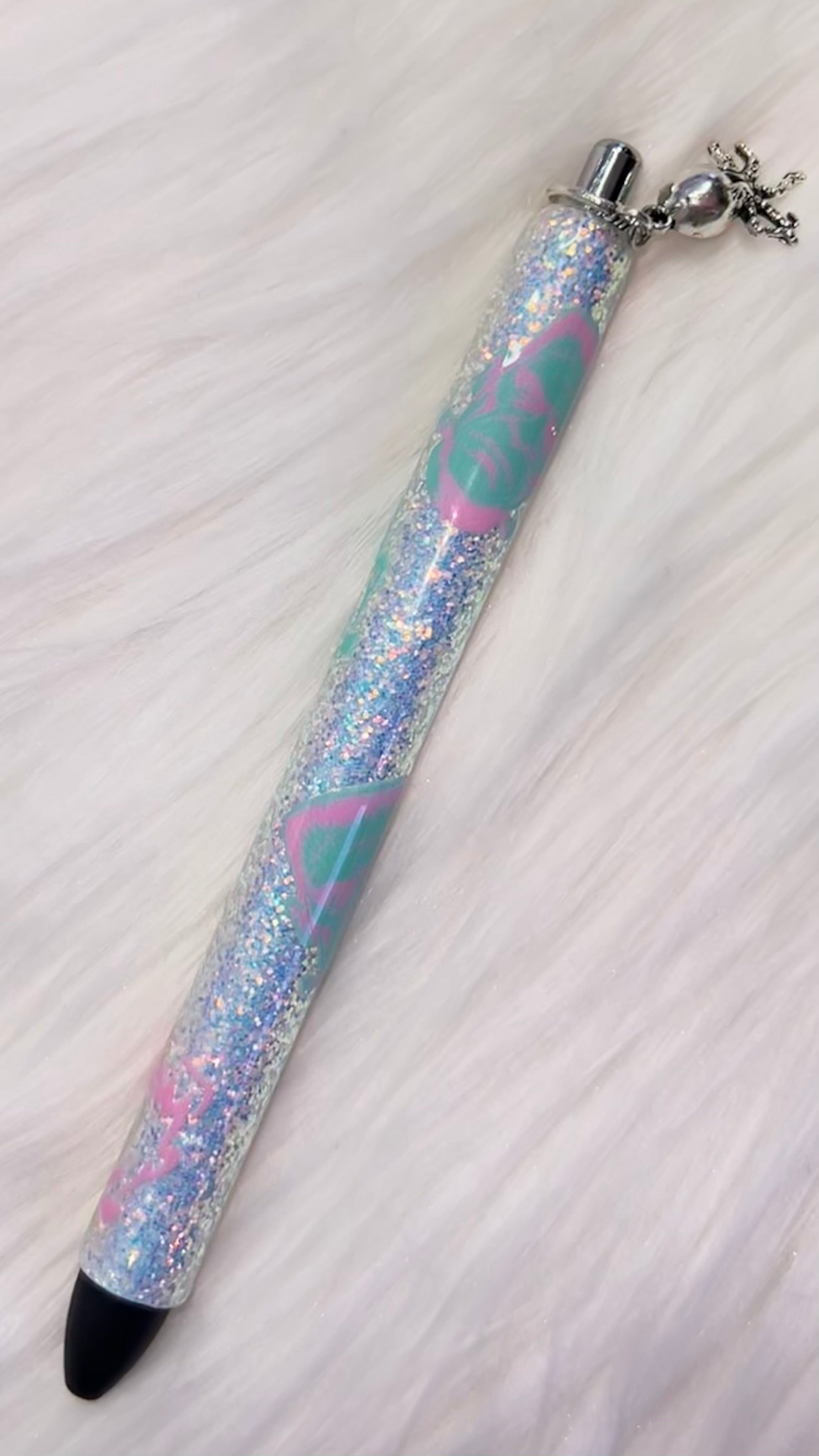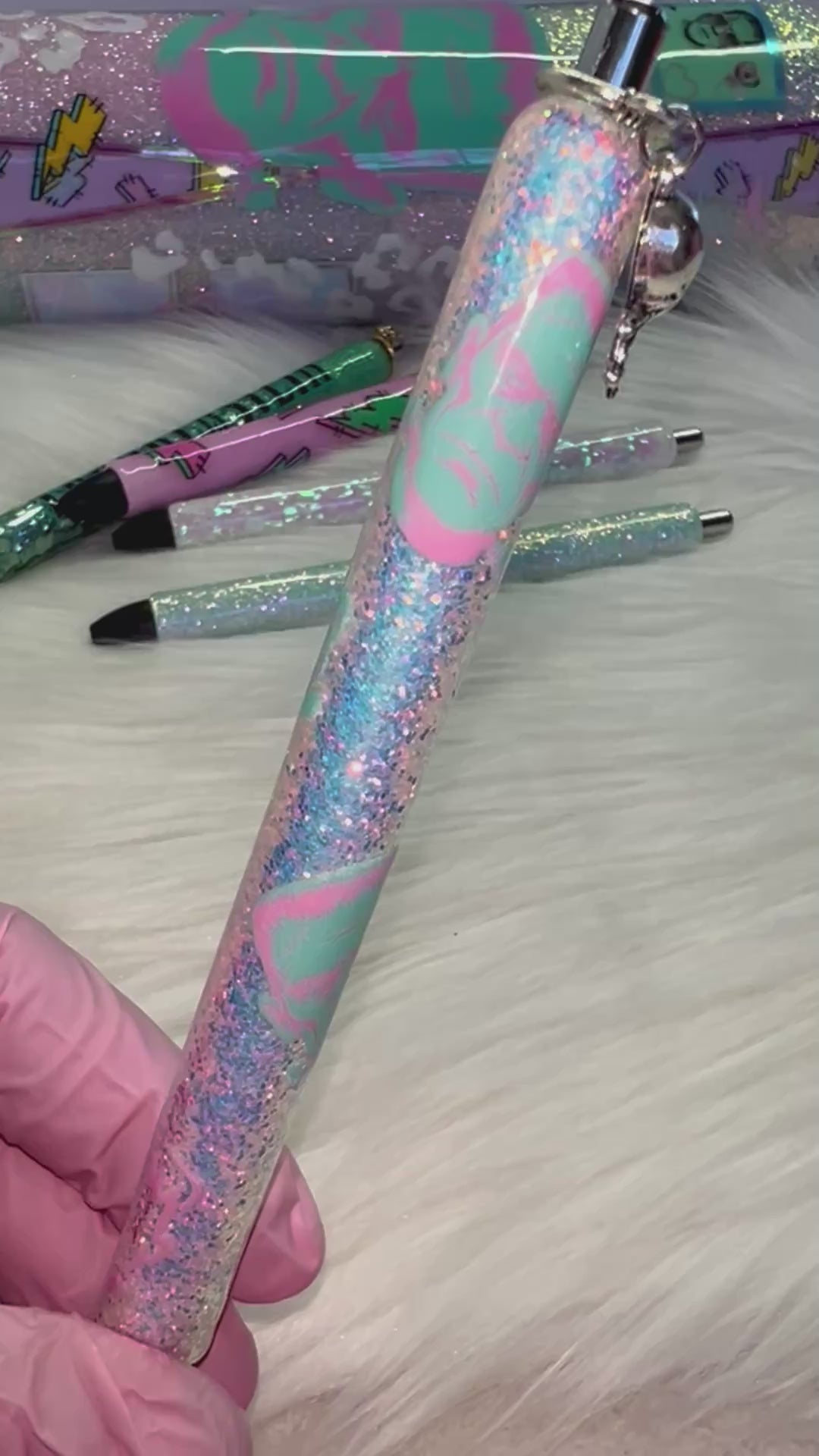 Iridescent silver-blue glitter with teal and pink Frankenstein decals — holographic perfection that glows year-round ✨💖
