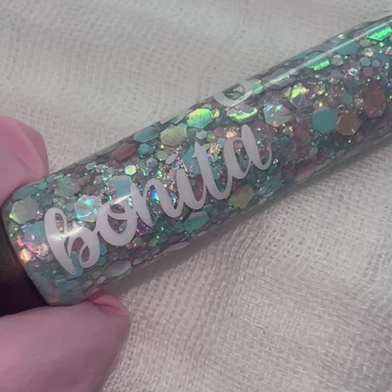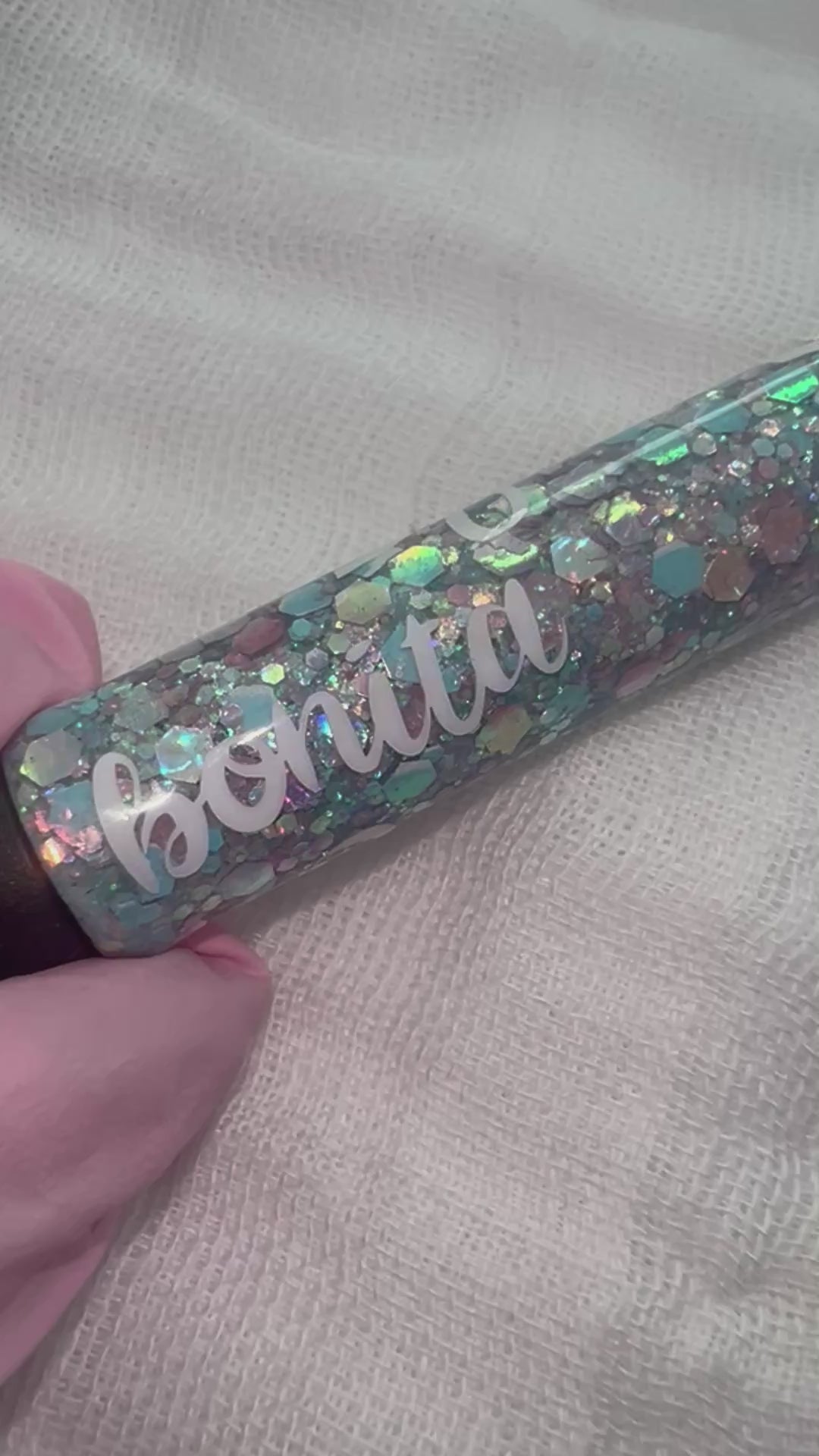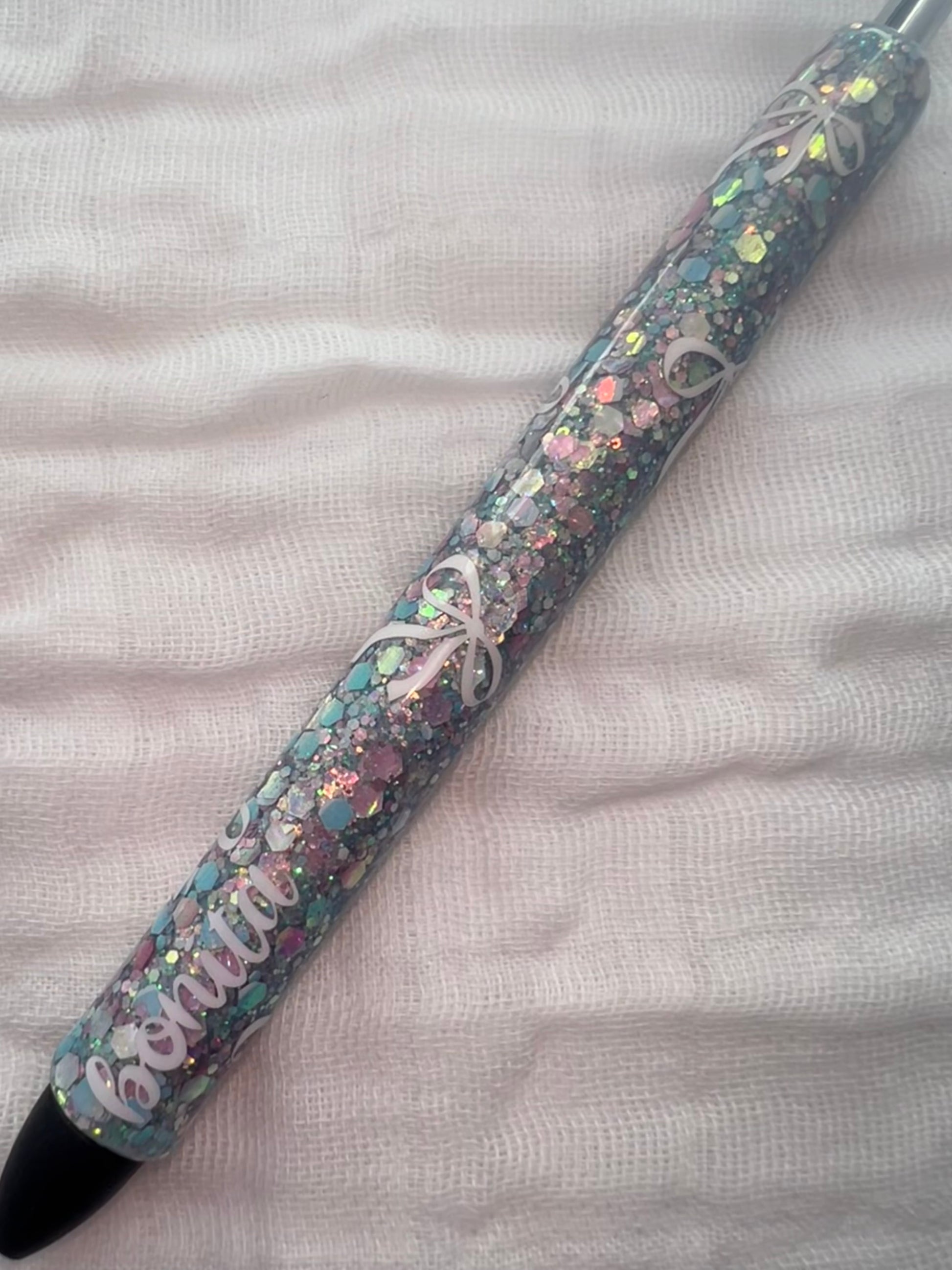 Shimmering teal and lavender glitters dance beneath dainty white bows and the word "bonita." This pen says it all—you’re beautiful, inside and out.