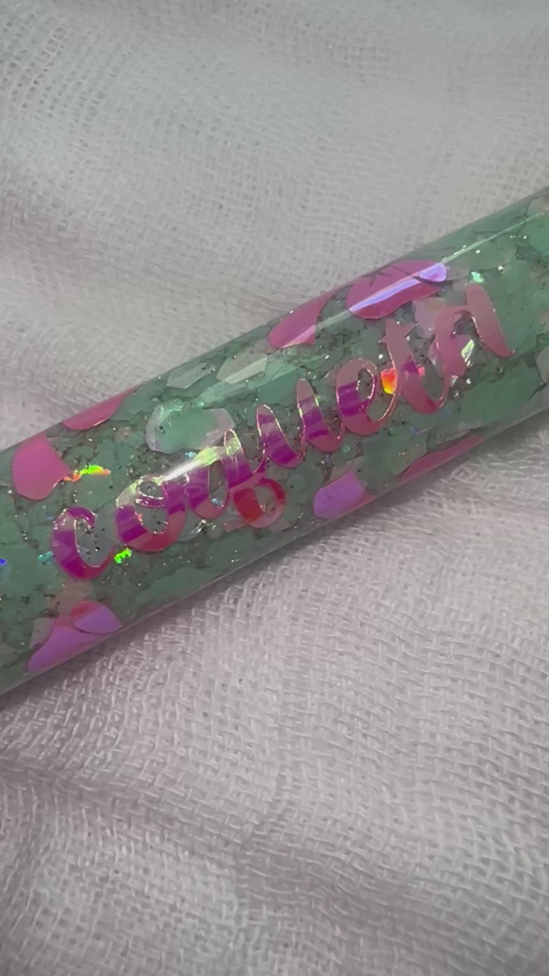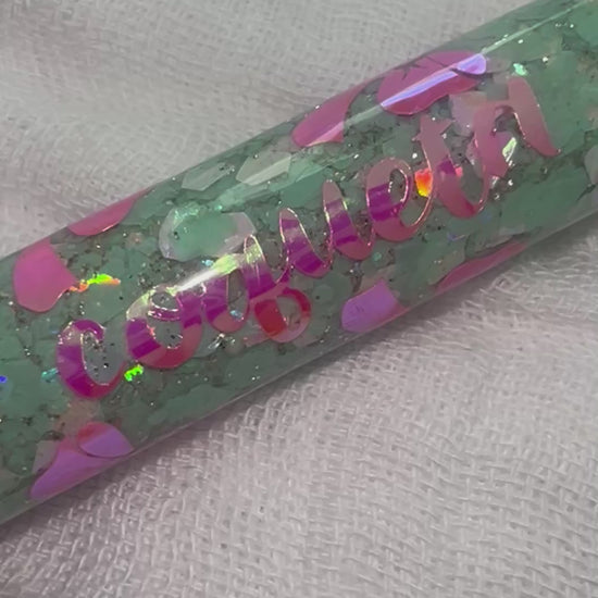 With a mint green base, chunky pastel shimmer, and bold hot pink bows and script, this pen was made to tease. It’s giving flirt, fun, and unapologetic confidence.