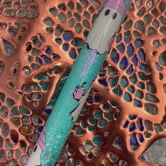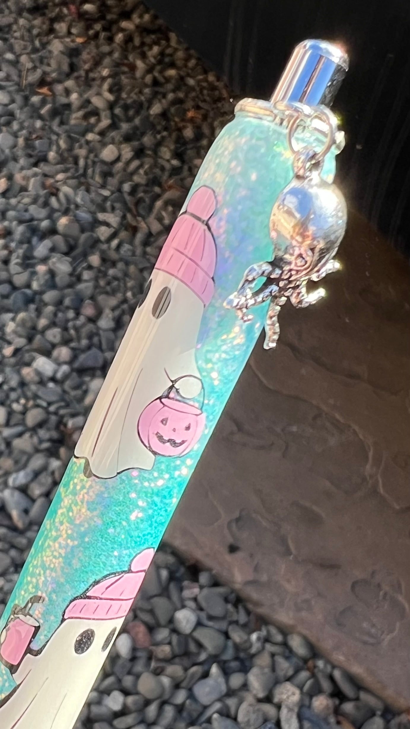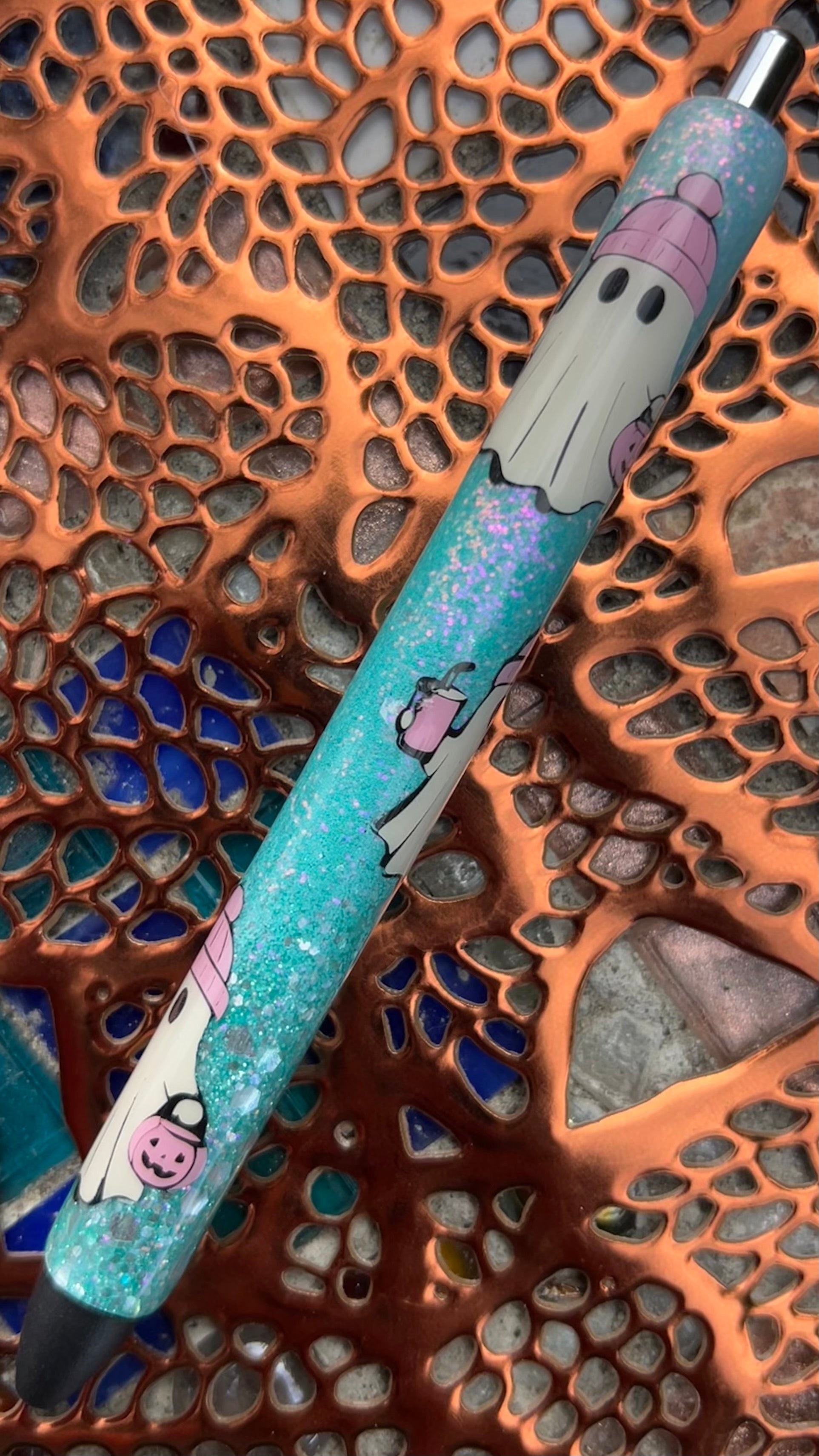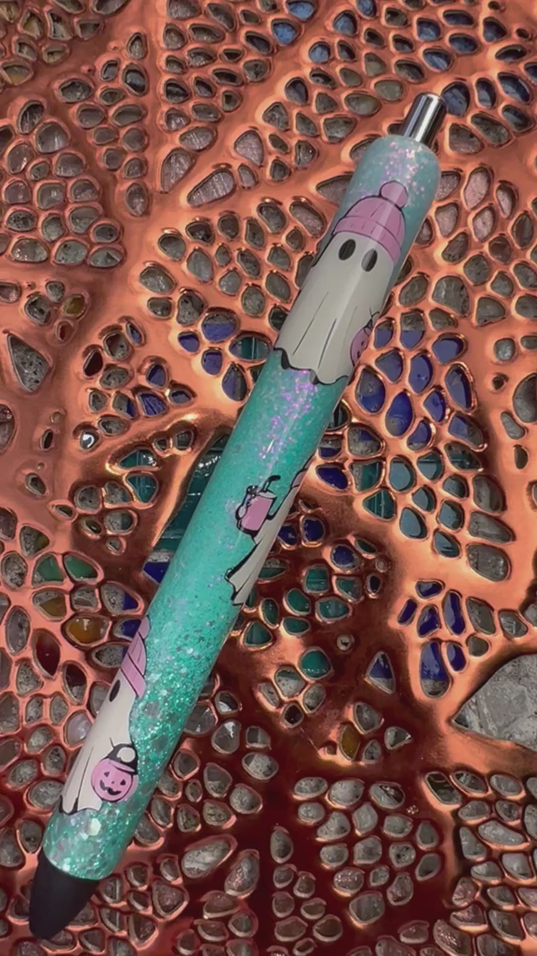 Minty-aqua glitter with pops of iridescent pink, featuring sweet little ghosts bundled in pink beanies & holding pumpkins. A spooky-cute vibe you’ll love all