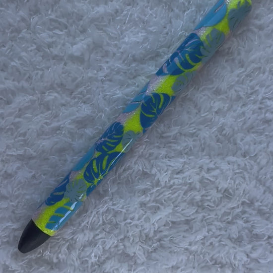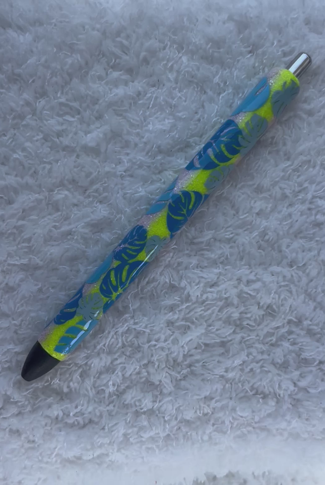 A vibrant twist of high-voltage neon yellow and soft pink glitter, layered with bold blue and pastel leaf patterns. This pen is for the wild hearts who live in color.