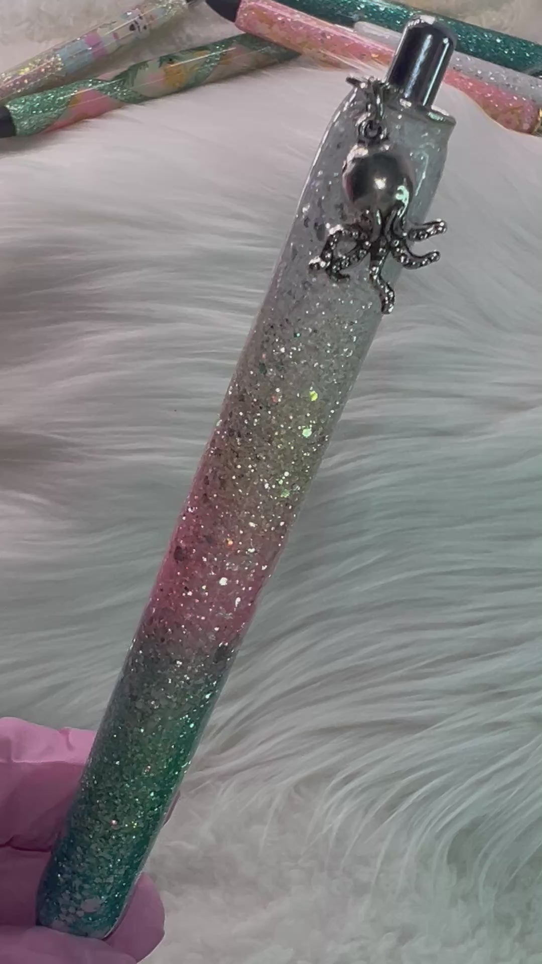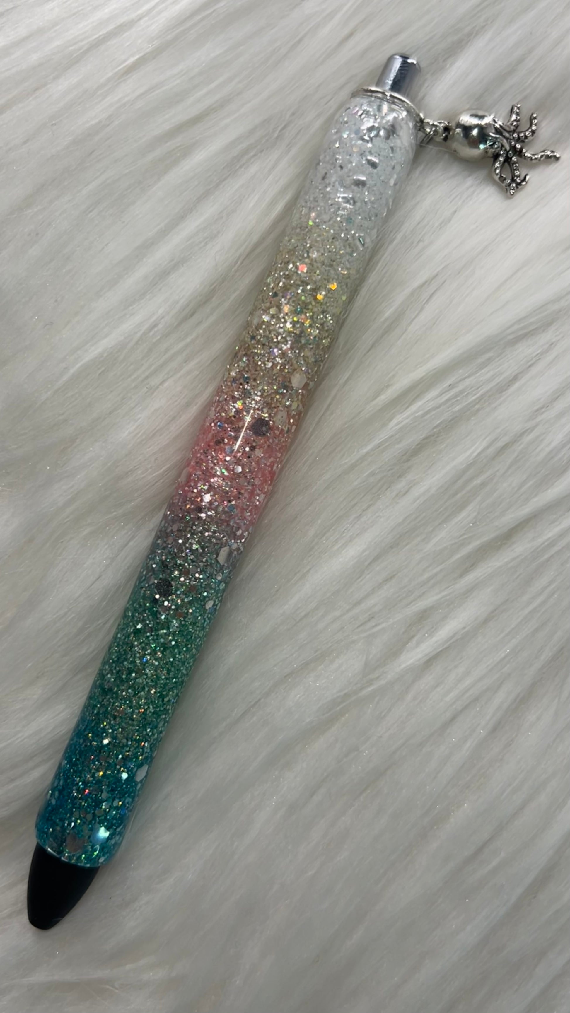 (Ombre white → coral → teal glitter with charm)