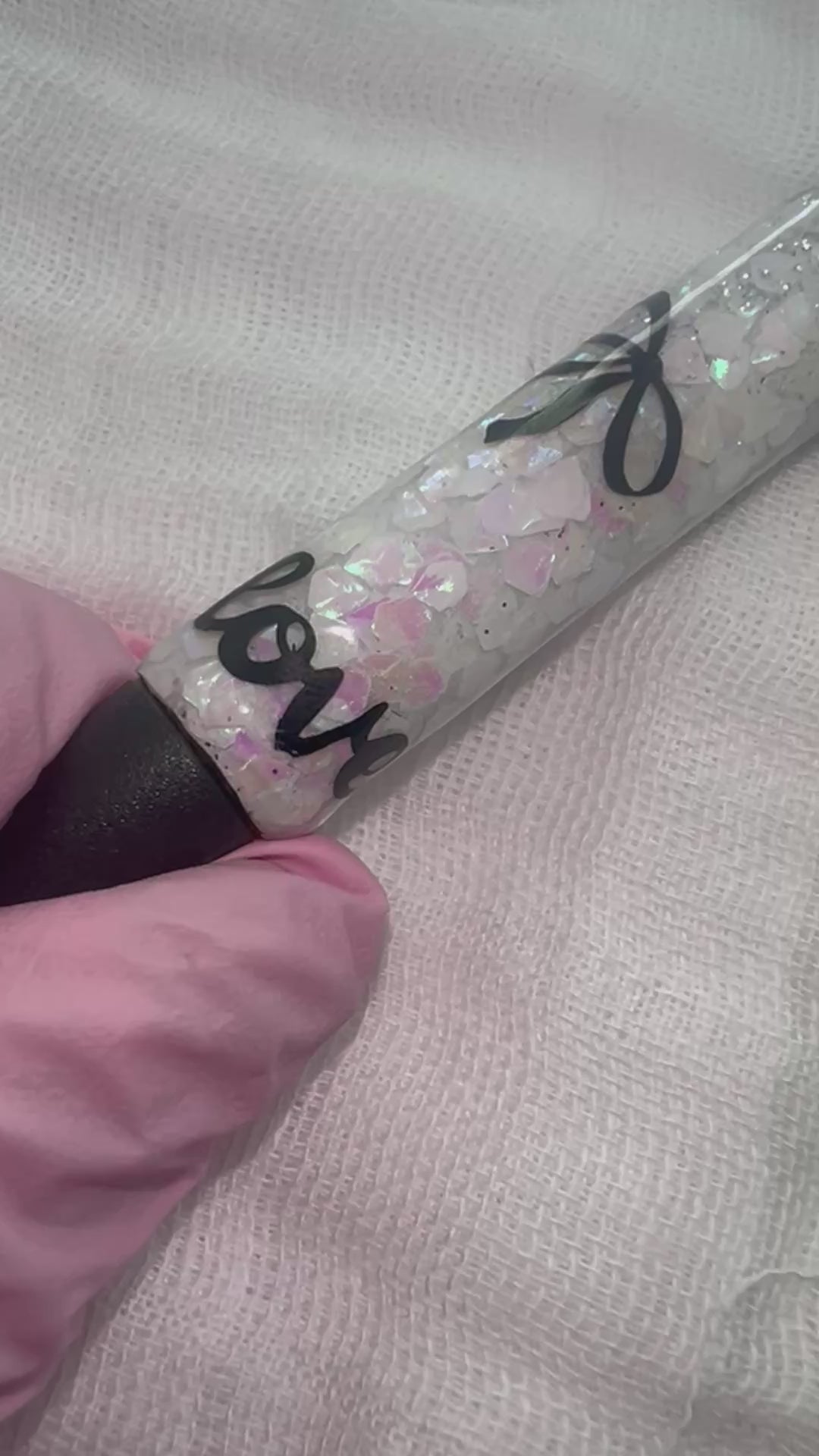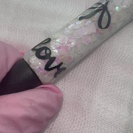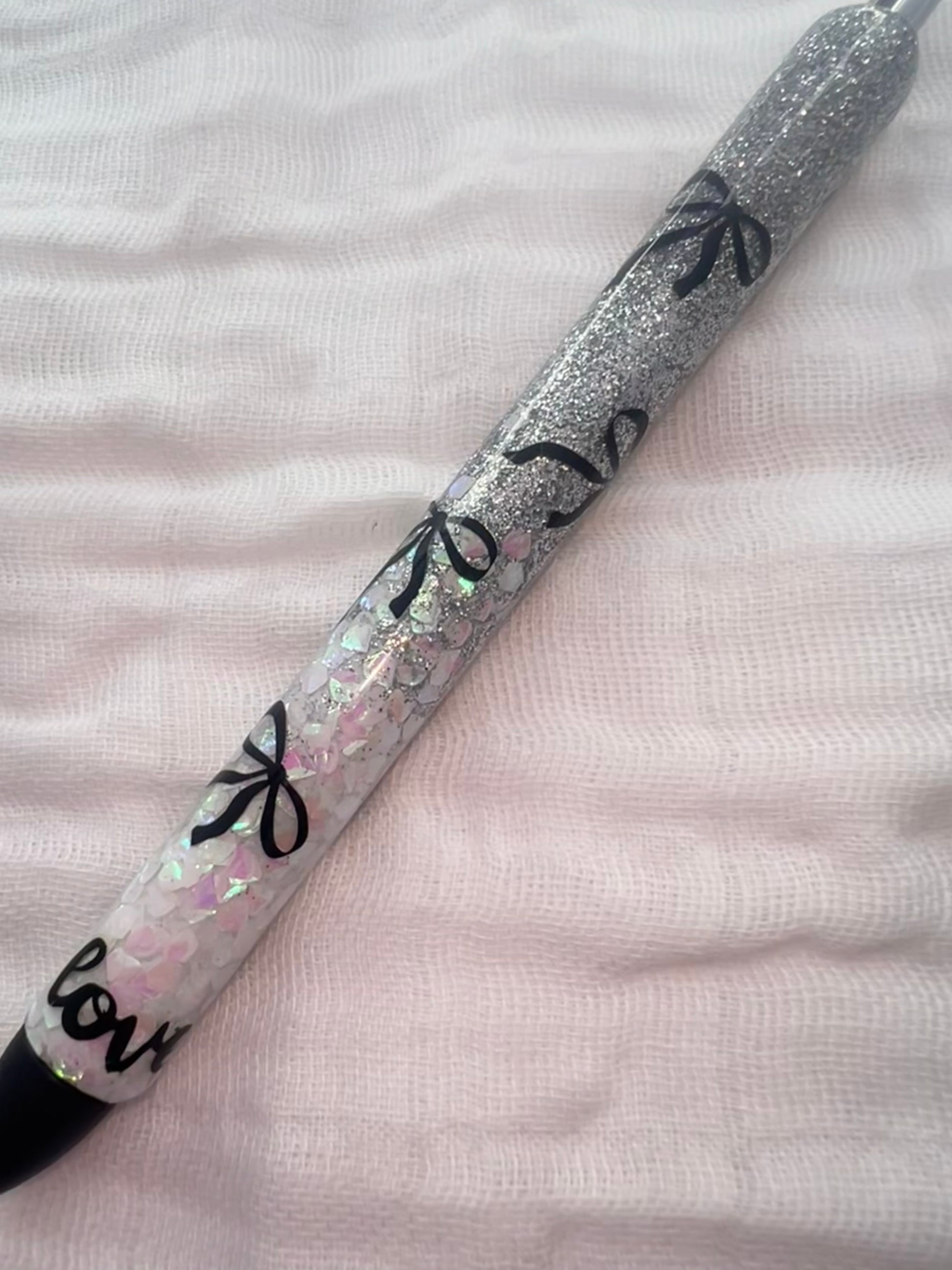 Half silver sparkle, half iridescent opal flakes—this pen is soft glam at its finest. Adorned with black bows and “love” in cursive, it’s a little romantic and a lot iconic.