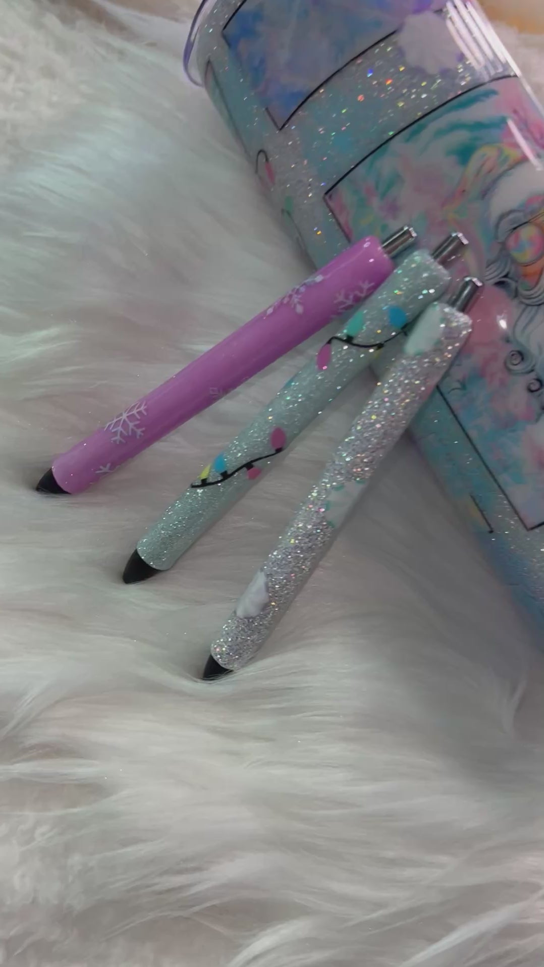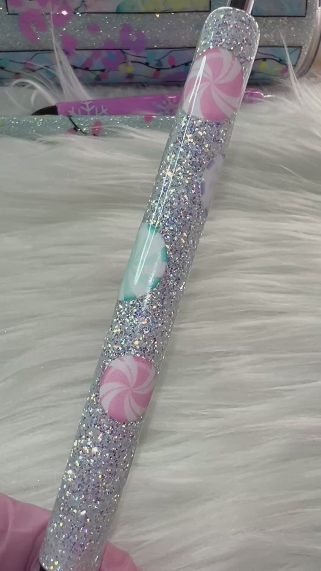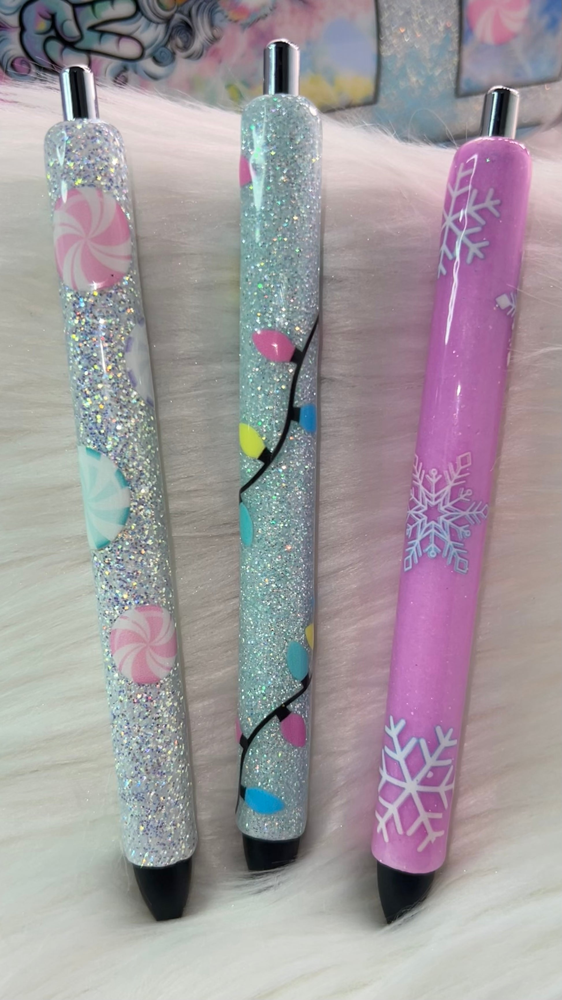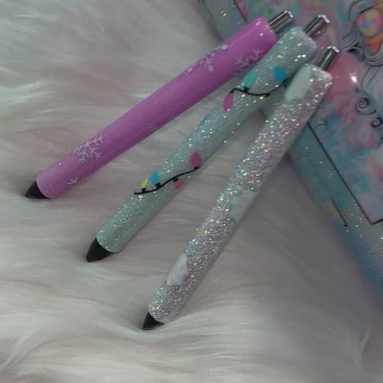 A dreamy winter pen filled with icy silver glitter that shifts and sparkles with every turn. Decorated with pastel peppermint candy decals in soft pinks, mints, and lilac tones, this pen gives sweet frosty Christmas vibes without being too bold. It’s lightweight, smooth-writing, refillable, and arrives in an adorable tin box for the perfect holiday gift.