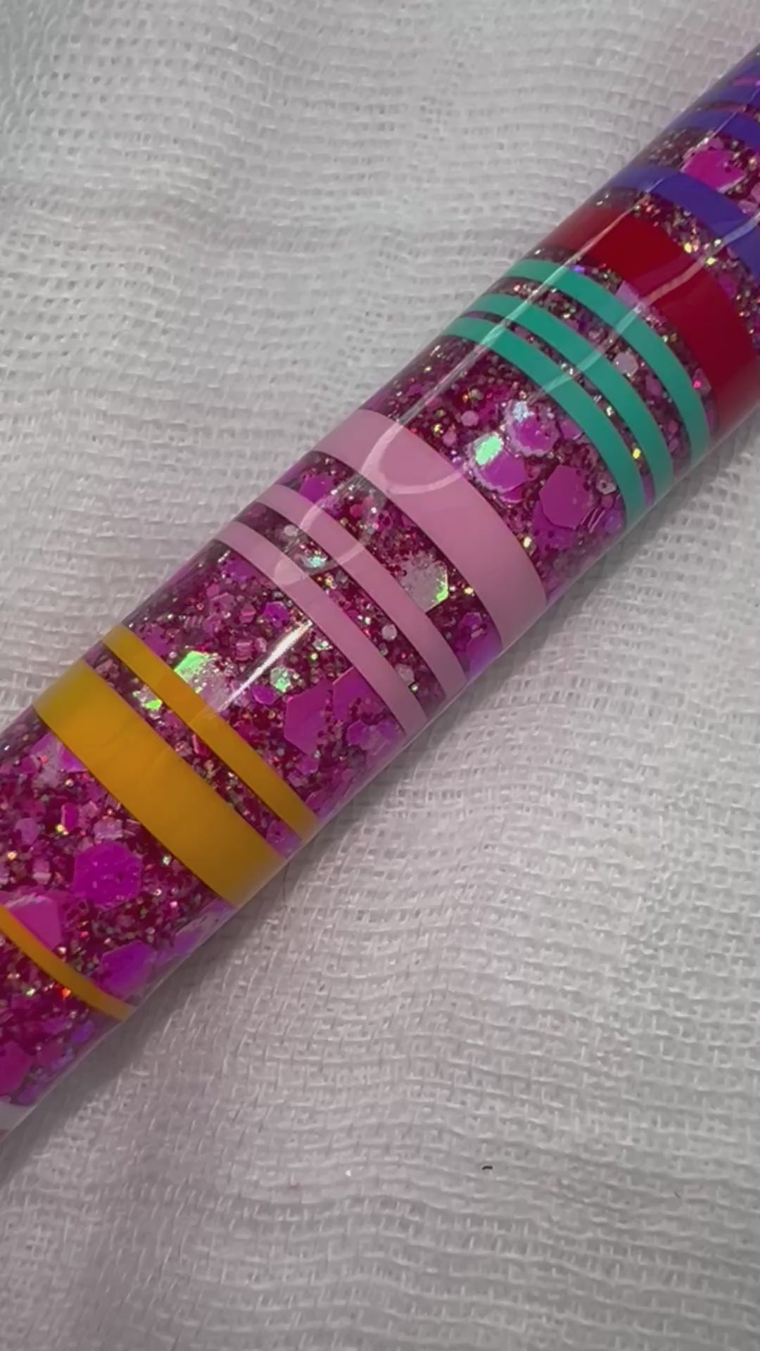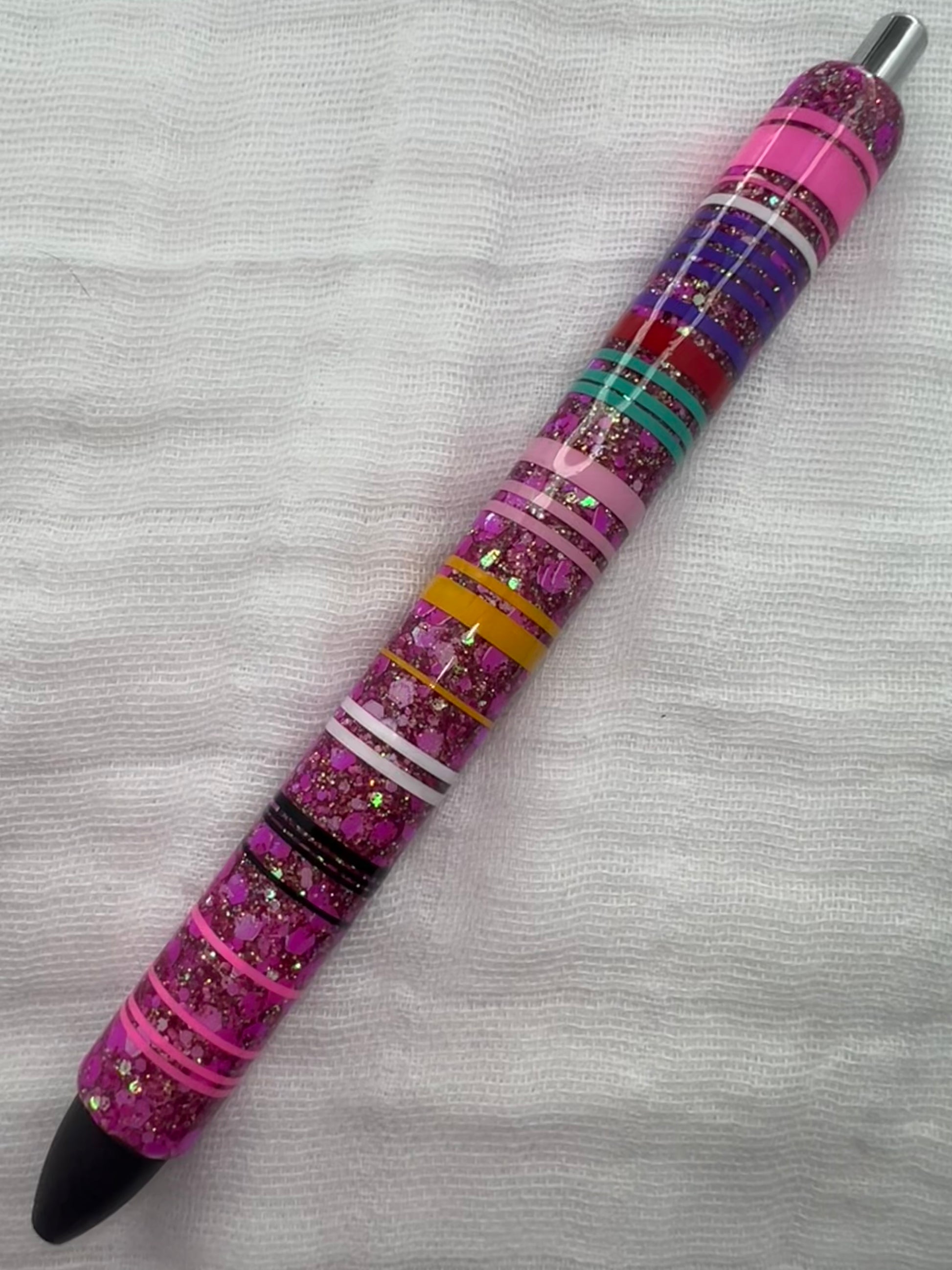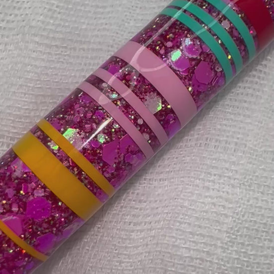 Inspired by the colorful beauty of traditional Mexican serape blankets, this pen features bold pink, turquoise, red, and yellow stripes on a deep magenta glitter base. It radiates joy and cultural richness.