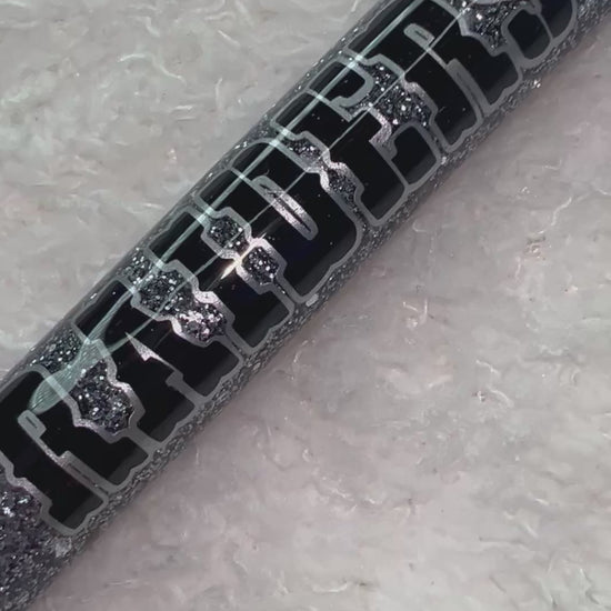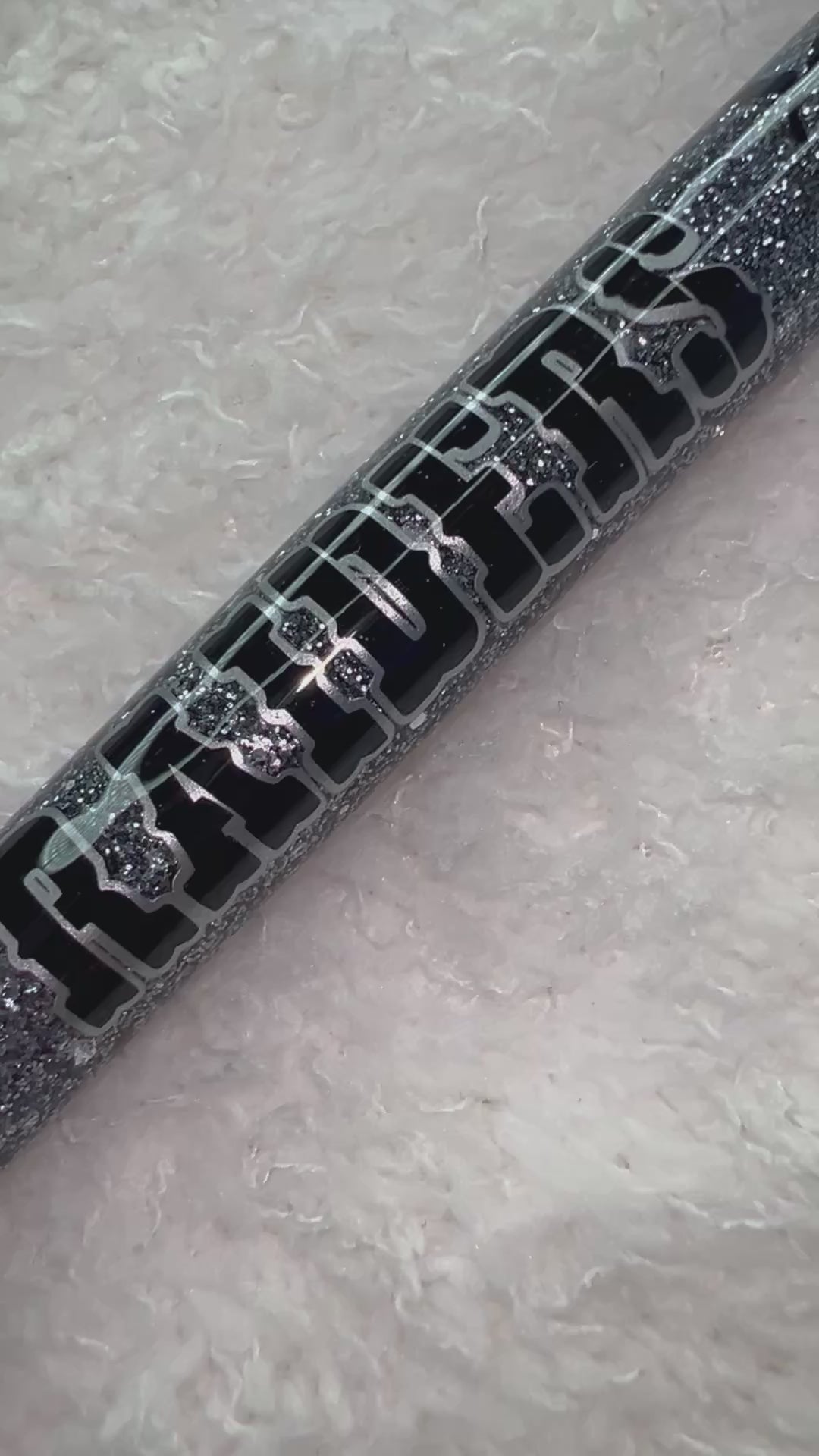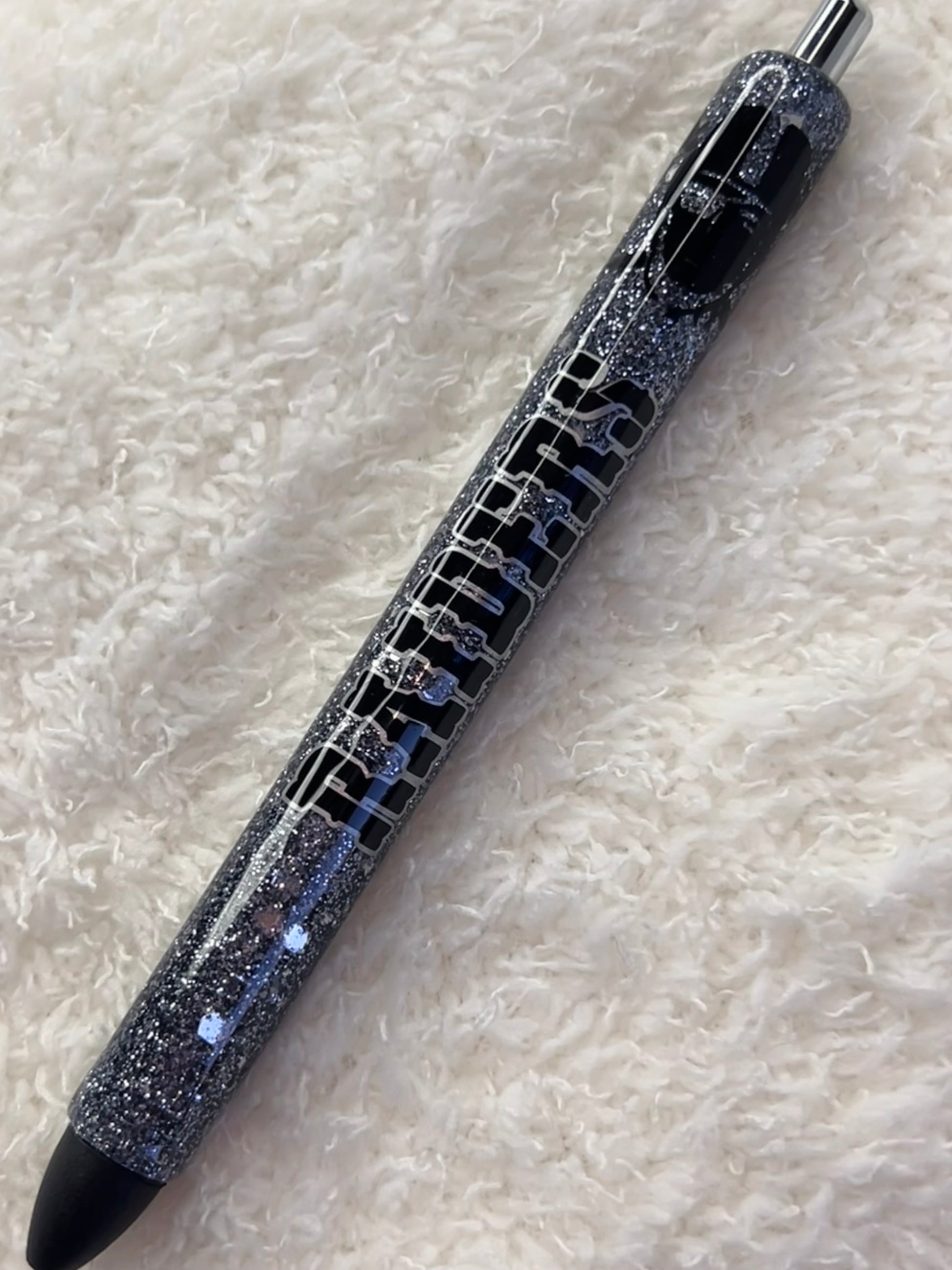 Classic Raiders vibe with a sparkle twist. Silver glitter, bold decal—pure intimidation, but make it pretty.