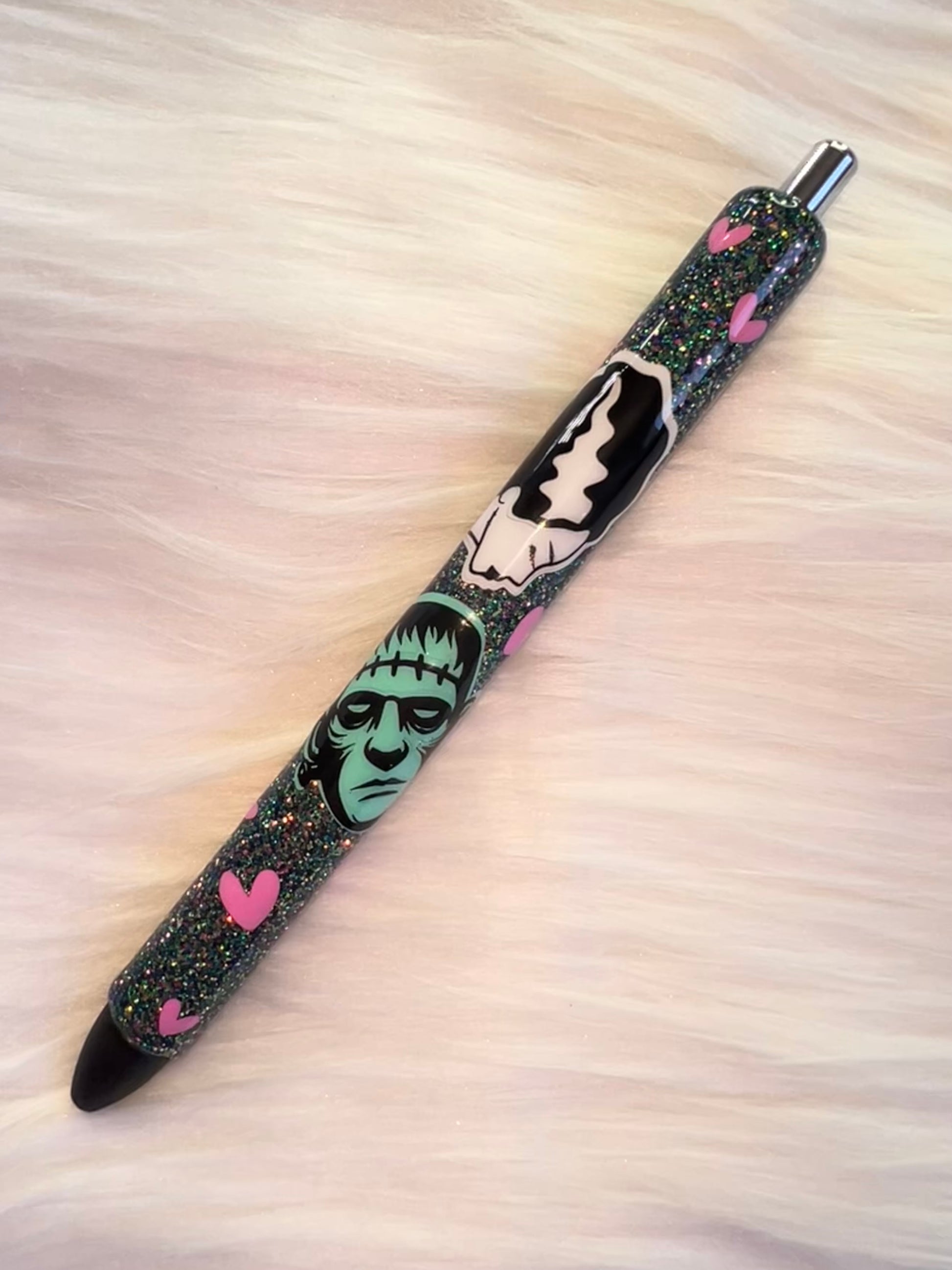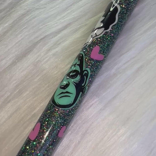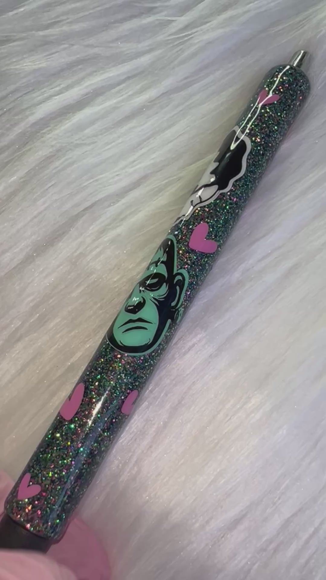 - Frankenstein and his Bride on a swirling Venom glitter base, framed with soft pink hearts. A chilling mix of dark love and sparkle.